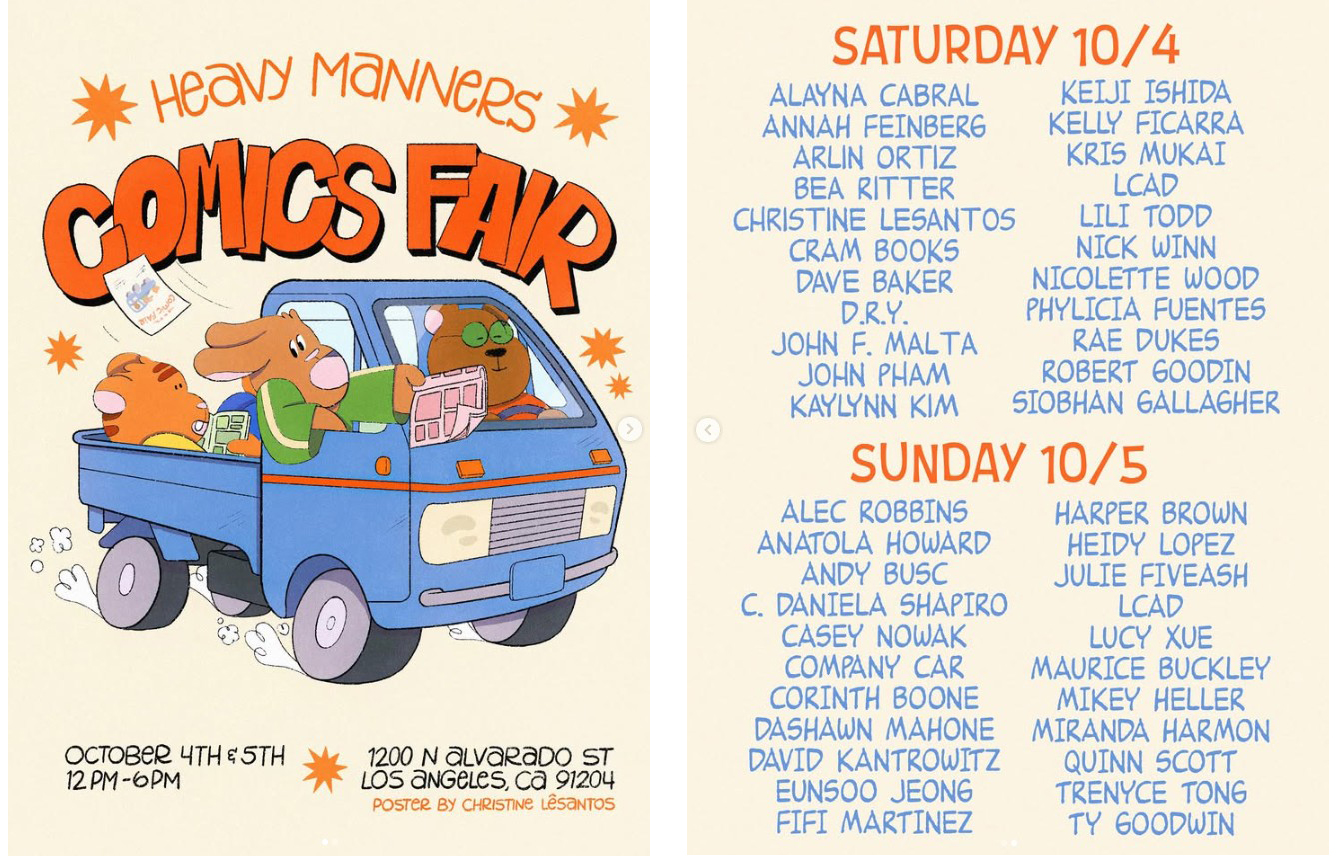 If you are around L.A. – This weekend, October 4th and 5th is the Heavy Manners Comics Fair. I was looking over the guest list, and there’s going to be some Hullabaloo creators there! Rae Dukes, Dashawn Mahone, and Mikey Heller! And a ton of other rad creators. Go get some fun comics this weekend!